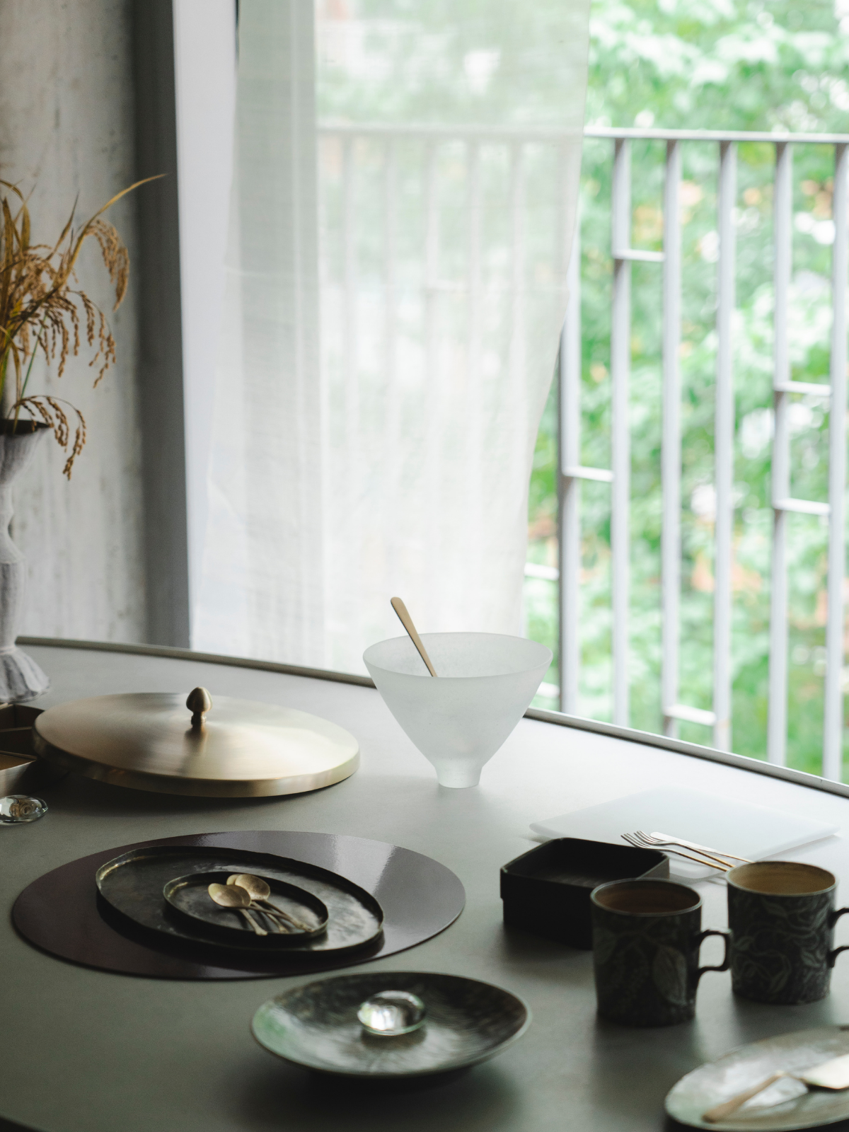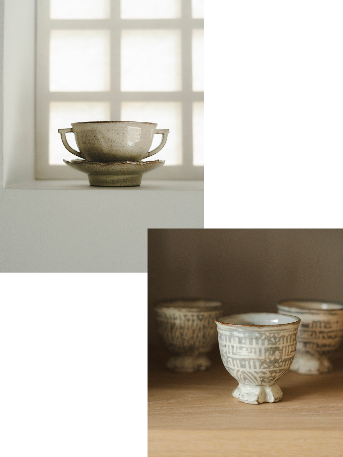 店内には、白、黒、ベージュと、淡く静けさを帯びた磁器の数々。デザイナーのジ・スンミンとディレクターのチャン・ウリムが立ち上げたブランドは、龍仁(ヨンイン)市のアトリエで磁器を中心に制作、ソウルに直営店を構える。”経年変化”を意味するシグネチャーシリーズの「Pati na」は、石や金属の表面に見られる時間経過の美しさを表現。朝鮮時代のクラシックなうつわのフォルムをモダンに再解釈した実用的なコレクションが評判だ。