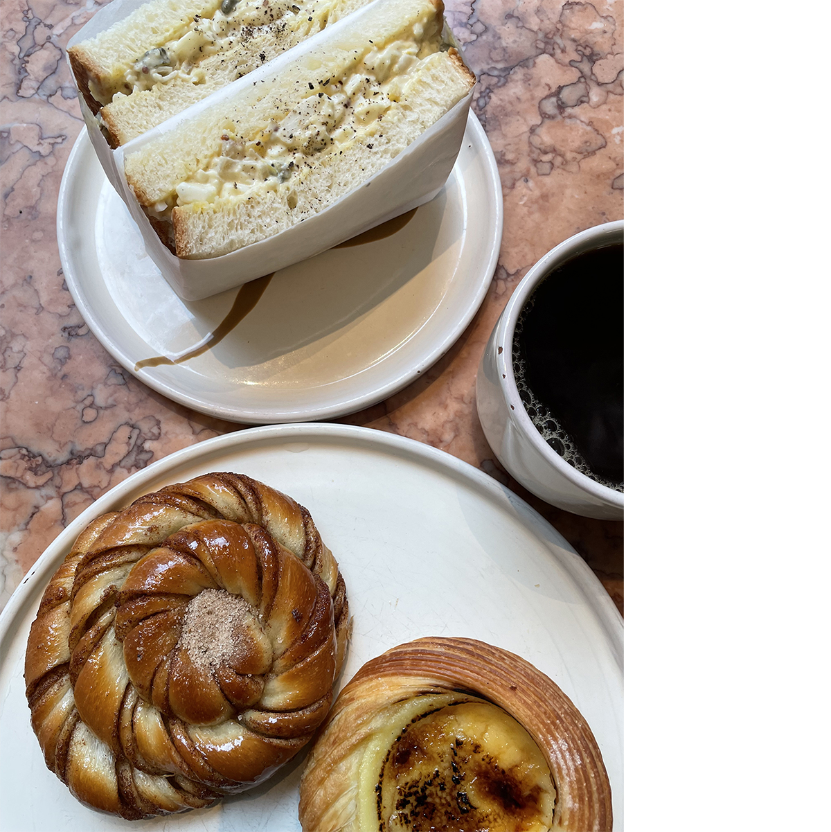 酸味が効いた卵サンド75DKK(約1,660円)、シナモンロール35DKK(約860円)、デニッシュの定番「スパンダワー」をクレーム•ブリュレ風味にアレンジ。40DKK(約990円)。