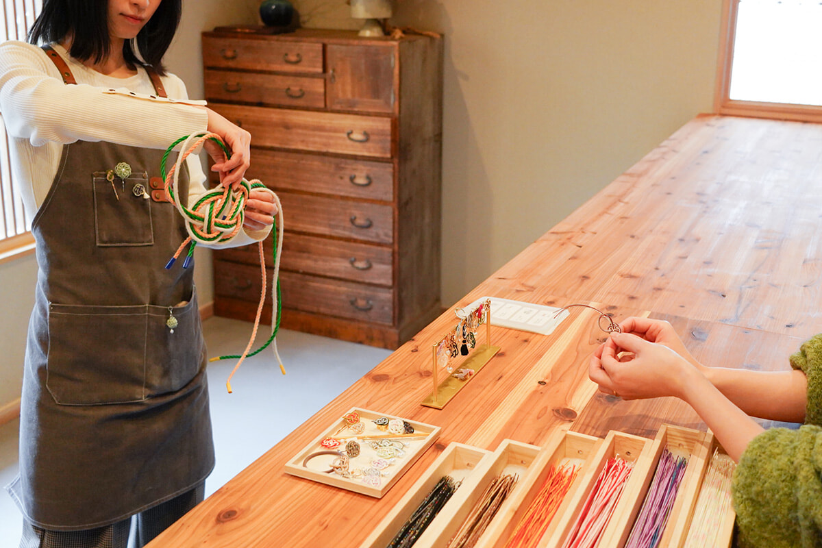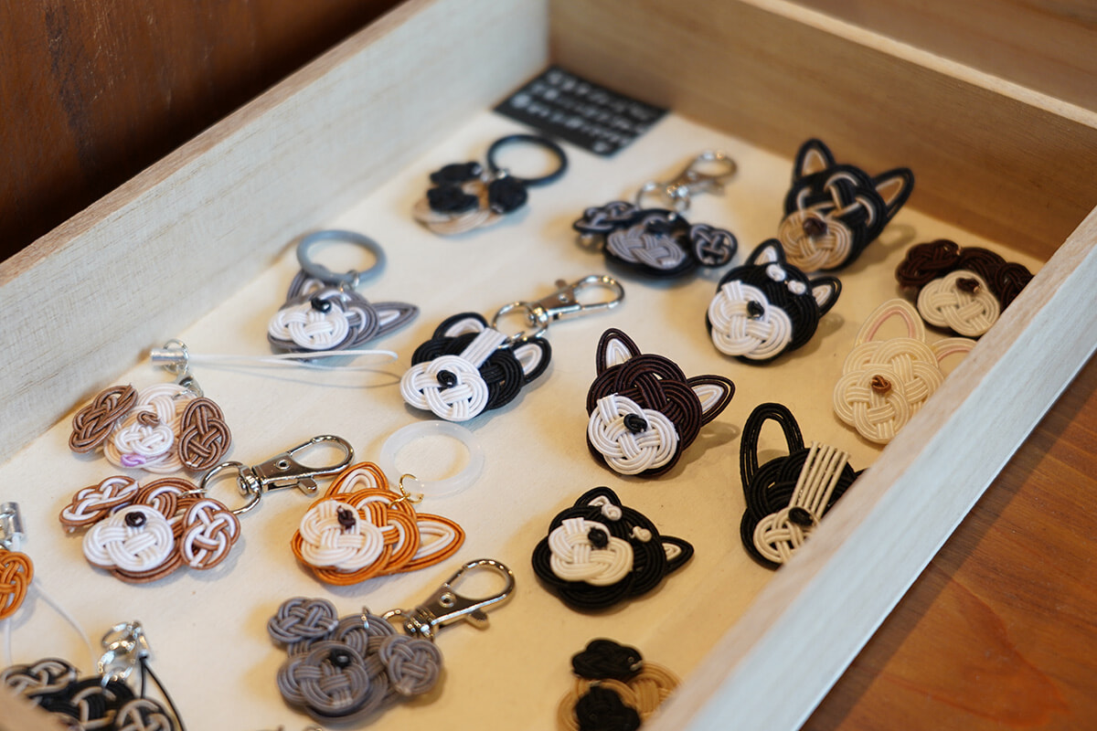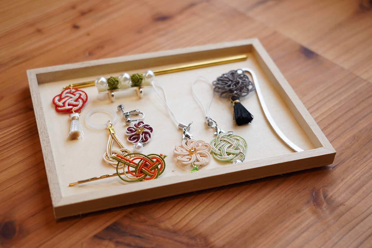 つくった水引は、ストラップやかんざしなどにして持ち帰れる。結び方も、基本のあわじ結びのほか、梅結びやかけ結び、玉結びなど、印象の異なる結び方を教えてもらえる。