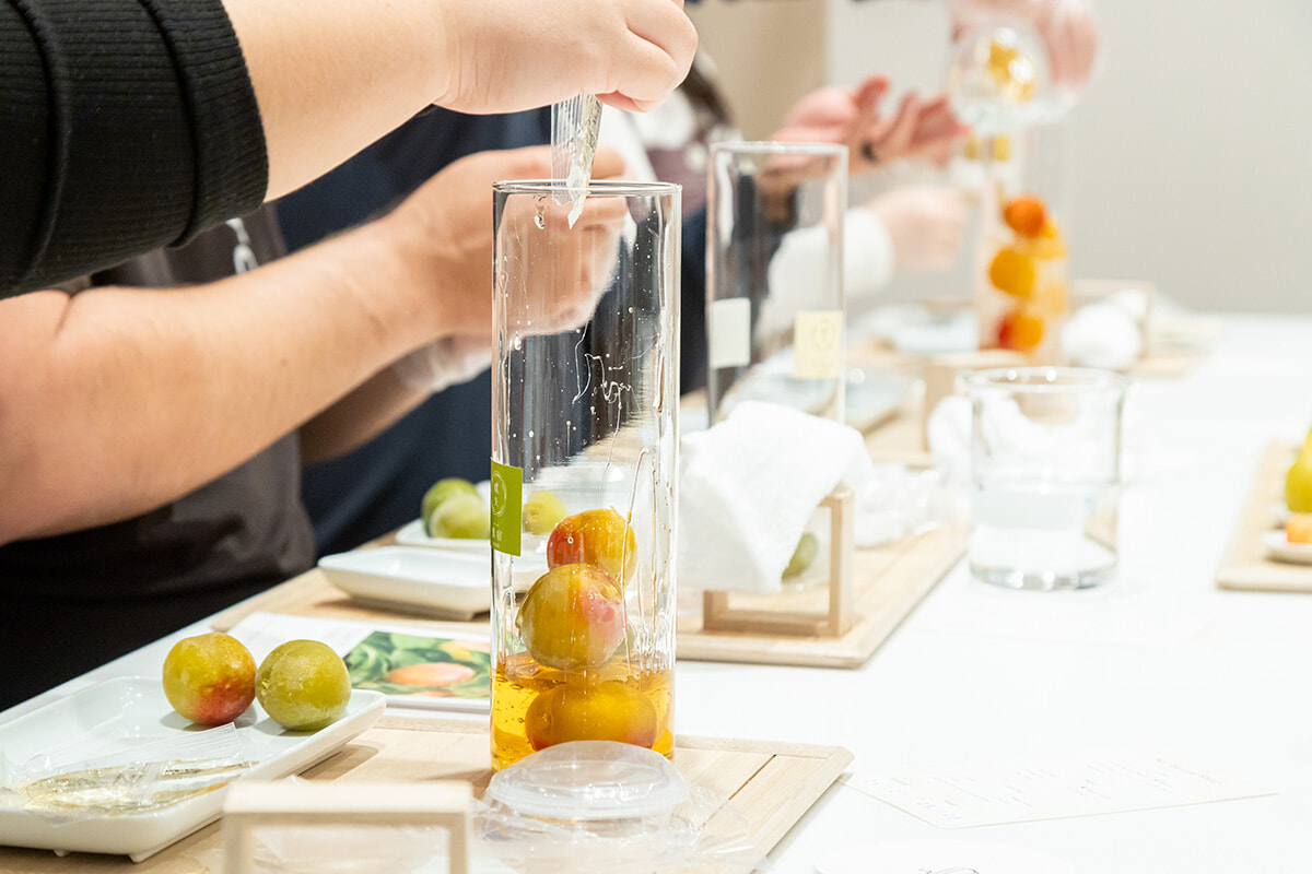 体験のはじめに、まずはフルーティーで濃厚な味わいの梅、完熟南高を氷砂糖と合わせたドリンクをテイスティングさせてもらう。