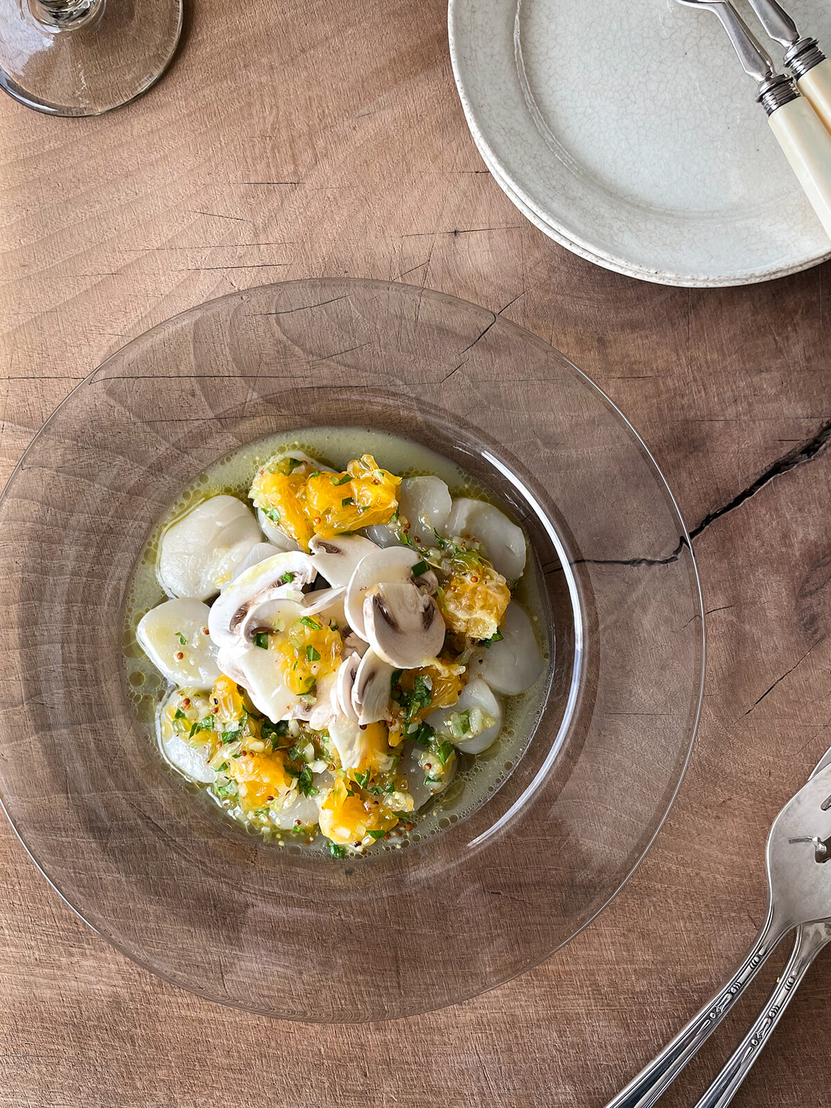 3. ホタテを盛ったうつわに1のマッシュルームをのせ、2のドレッシングをかける。