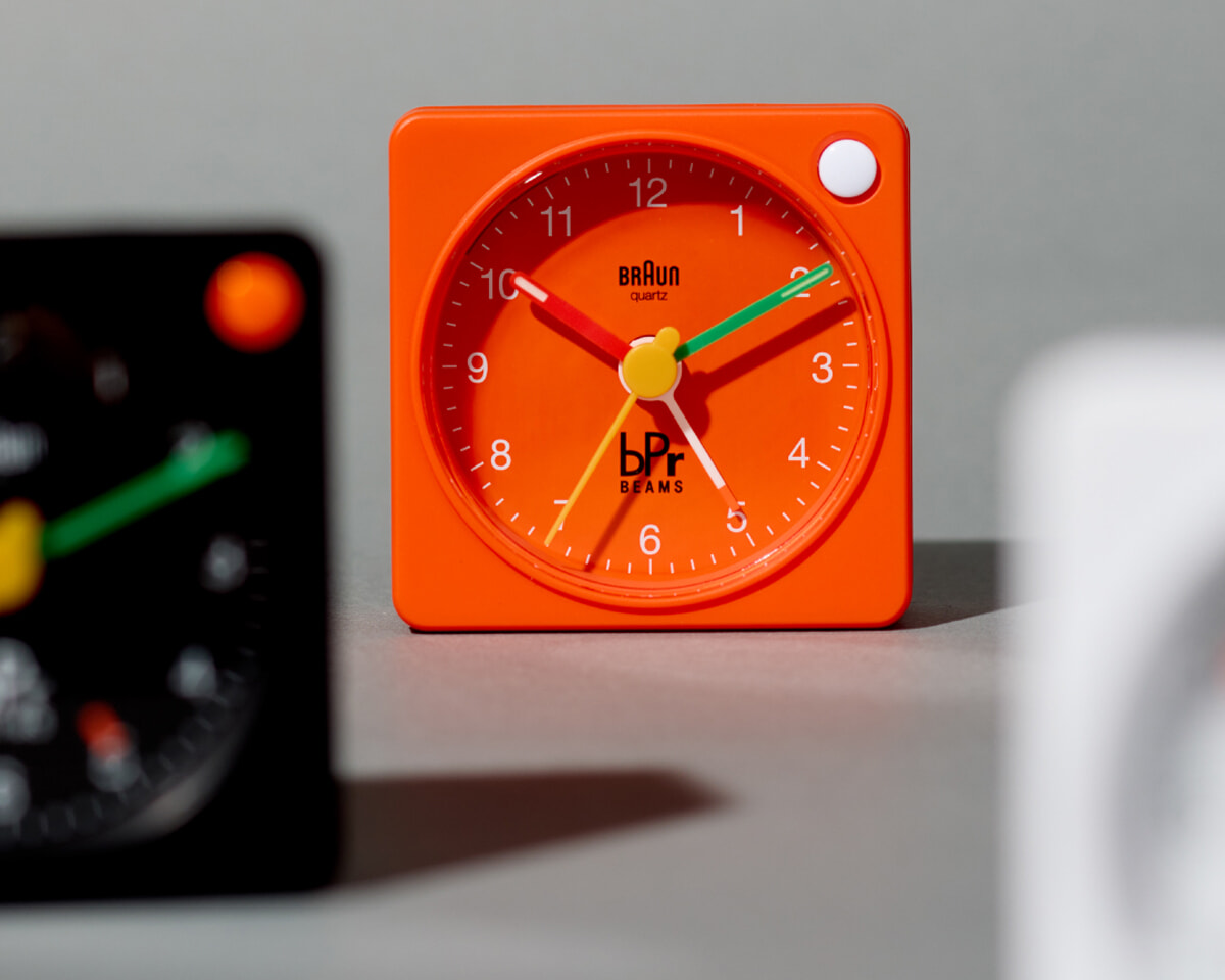 よく見るとアラーム針の先もオレンジ。雑貨レーベル、bPrビームス展開店舗なら全国どこでも購入可能。BRAUN × bPr BEAMS アラームクロック「BC02X」各¥6,050(3月26日発売)/すべてビームス 銀座