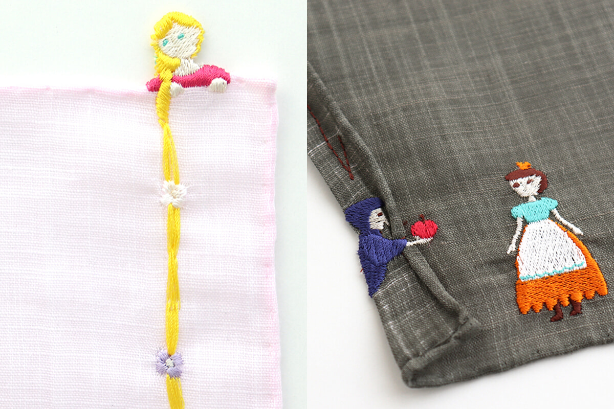人魚姫や白雪姫といった王道ヒロインから、ディズニー映画でちびっ子たちの一躍人気者となったラプンツェルまで。そのどれもが、ミシンではなく、一枚一枚手作業でふちを縫う”手巻き”縫製によってつくられている。高い技術を要するデザインは、1879年創業の老舗・ブルーミング中西が展開するハンカチーフ専門店だからこそできること。機械での縫製に比べ、柔らかくふっくらとした仕上がりが特長だ。