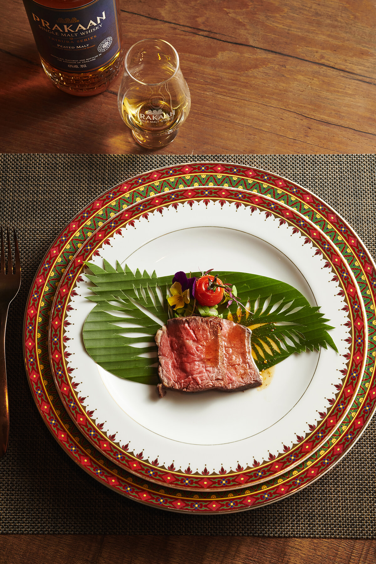 個人的には『ヌア・ヤーン(タイ風グリルビーフ)』とのペアリング をおすすめします。チリ、ライム、ナンプラーを使った爽やかなディップソースとともに提供されるグリル料理で、香ばしい焼き目と旨味のある味わいは、このウイスキーとぴったり。チャーシューのように炭火で焼き上げた肉料理と合わせるのもおすすめです。キャラメリゼされたソースの甘みとロースト香が、ウイスキーの柔らかなスモークのアロマと見事に調和します」