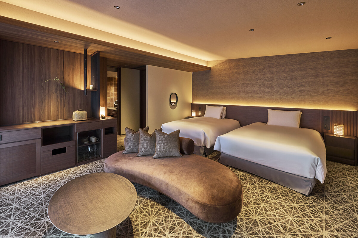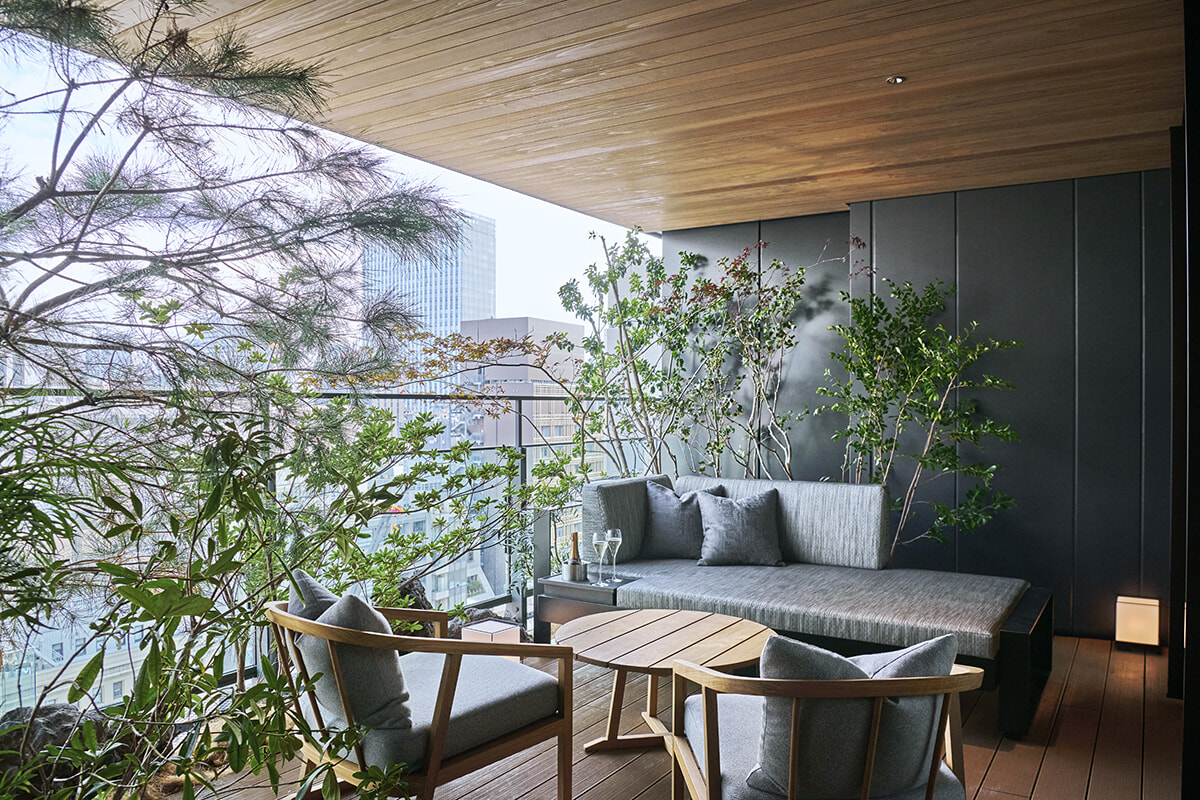 客室数は全34室。それぞれの客室には熱海から運ばれる天然温泉が引かれ、プライベートな客室温泉風呂が銀座で現実となりました。また、どの部屋にもバルコニーがあり、木々を植樹し庭園として設えてあります。都会の高層階ではバルコニーに出ることさえなかなか難しいですが、ここ「ふふ 東京 銀座」では、穏やかな空間として銀座の様子をバルコニーから眺められます。庭園には花木が植えられ、その中の1種が客室名と同じ名を持つ木であることにこだわりました。例えば、「ラグジュアリーコーナースイート」(80㎡)はバルコニーを含めると115㎡あります。この部屋名は「錦木/ニシキギ」といいますが、バルコニーに植えられた樹木の中に「紅しだれ」が他の木々に交じって植えられている、江戸の粋な計らいを感じます。