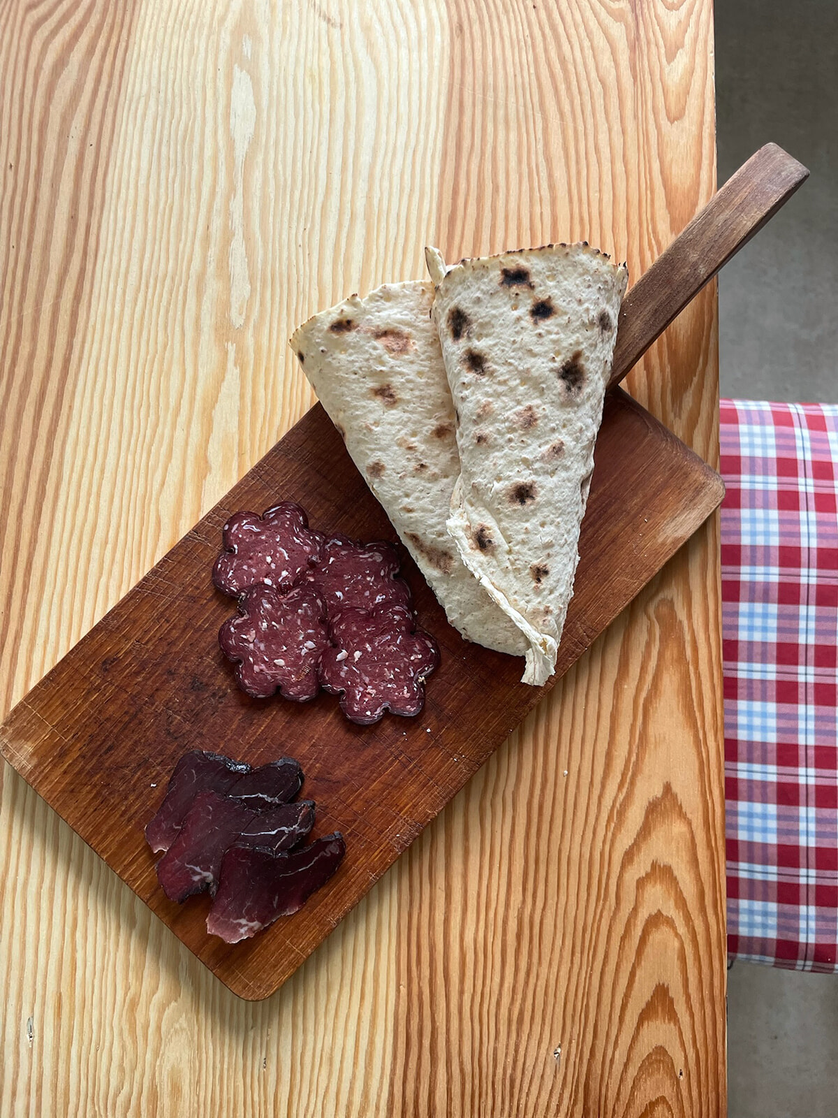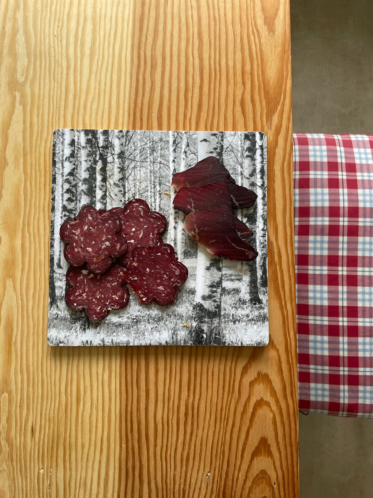 左の花形のようなものがトナカイのサラミ。少し濃い色のものがムース。トナカイのものは日本で食べられているサラミとあまり変わらないおいしさの一方で、ムースはかなり血の味が濃い癖のあるもの。