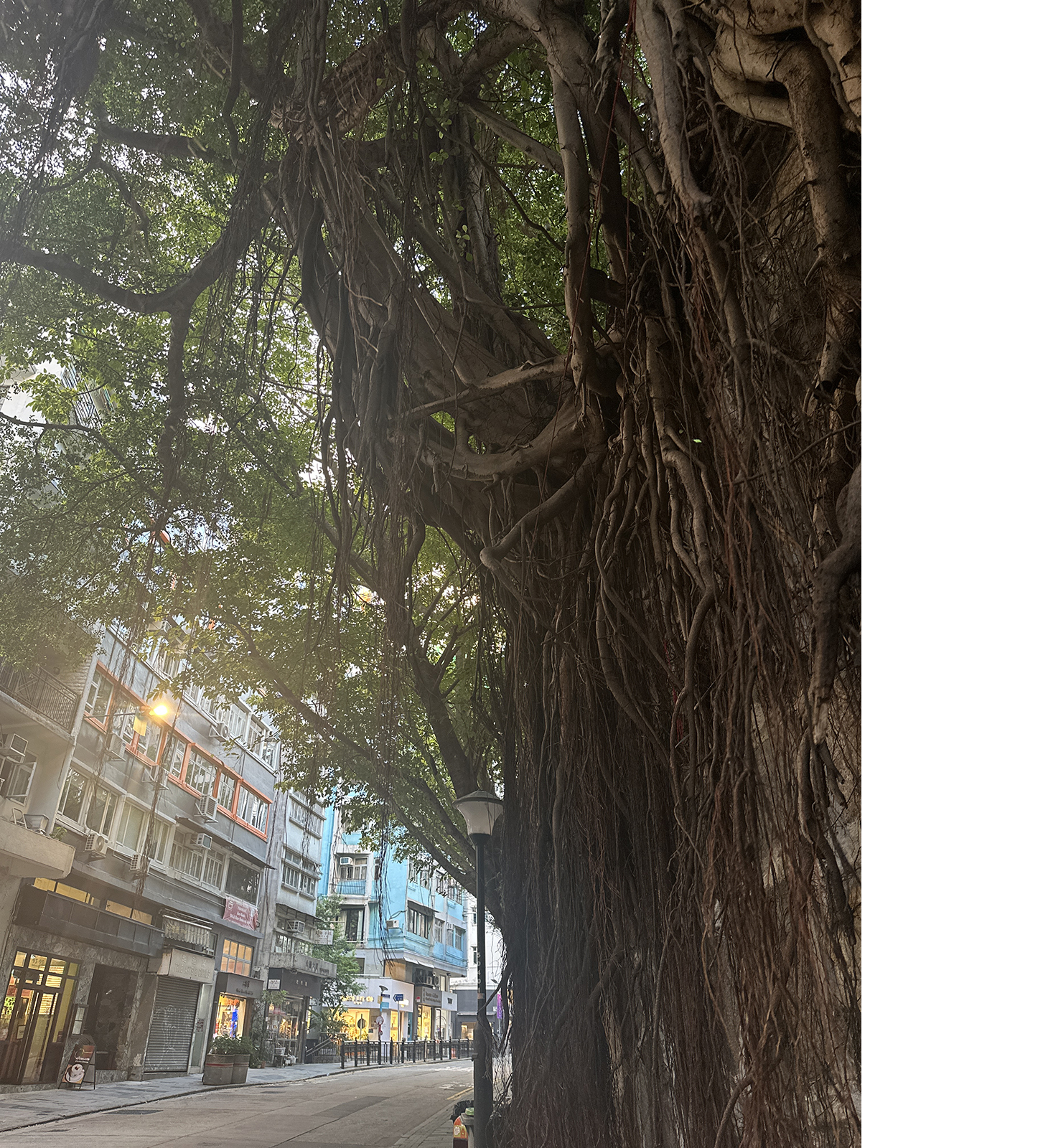 カラフルな街並みに迫力満点の菩提樹が、香港らしい風景のひとつ。