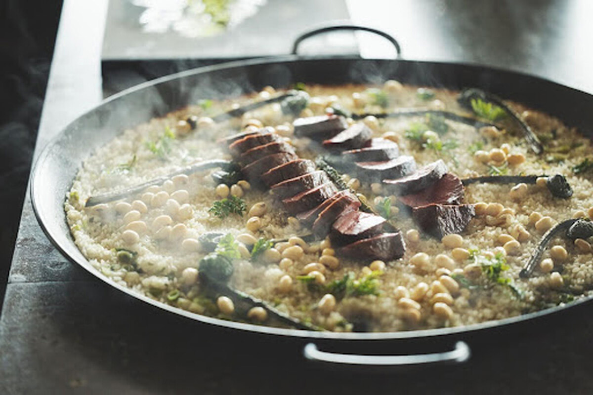 シグネチャーディッシュは、小諸市内の老舗鯉店で井戸水の中、丁寧に餌抜きされた鯉を薪火で焼き上げ、ジオヒルズワイナリーの赤ワインでマリネした逸品。これを鯉のアラとぶどうの搾りかすで仕立てたソースを合わせる。佐久地域の伝統食材と、新たな地域文化であるワインが出合った一皿だ。季節のパエリアには「song」のスタッフが育てた自社田のお米を使用。罠猟で仕留めた地元産の鹿肉や茅野市産の天然寒天に信州サーモンの藁焼きを組み合わせた一皿など、土地の記憶を凝縮した、静かで力強い料理が身上だ。