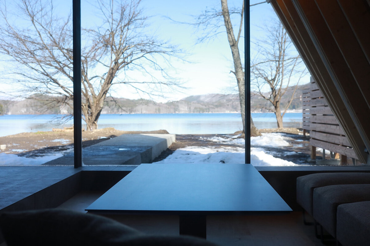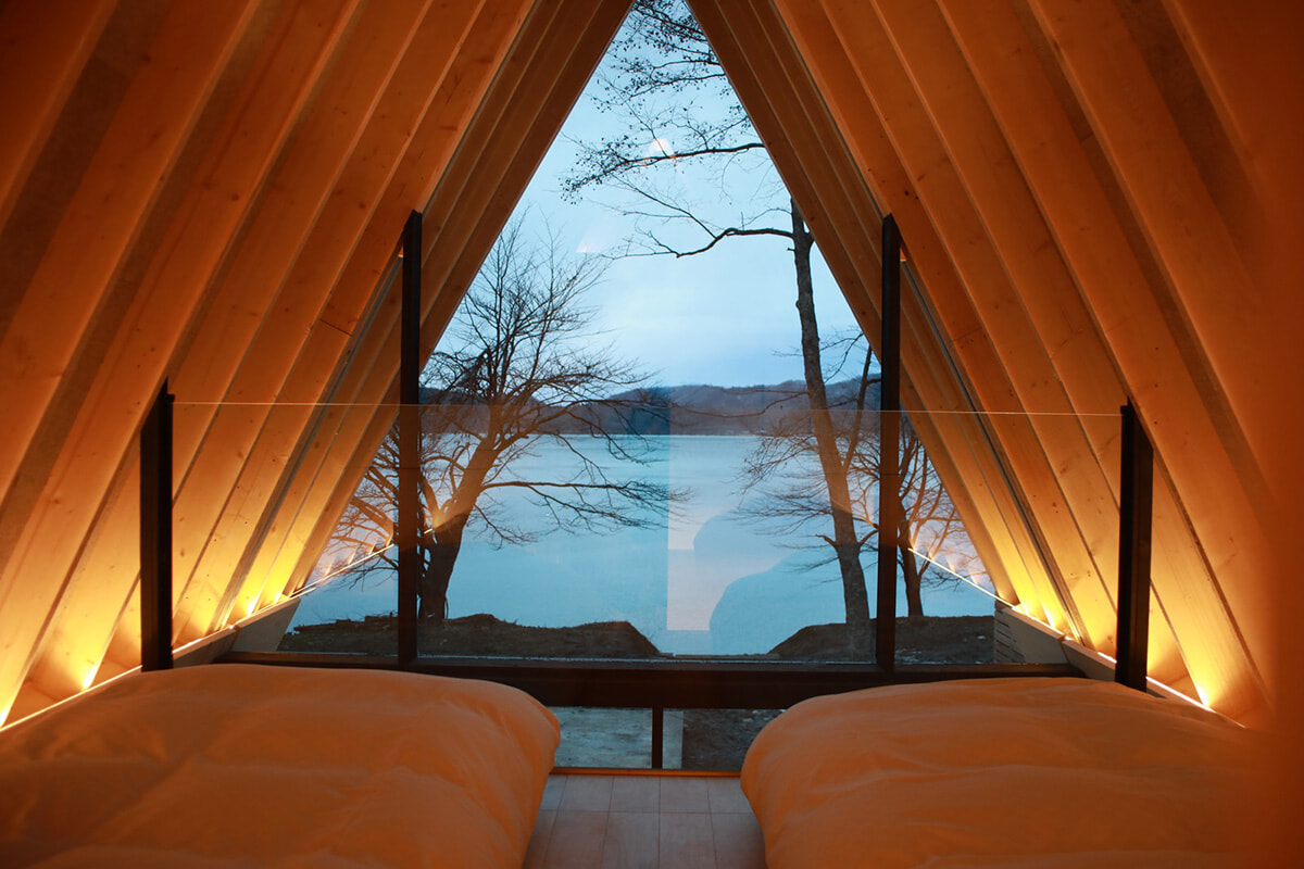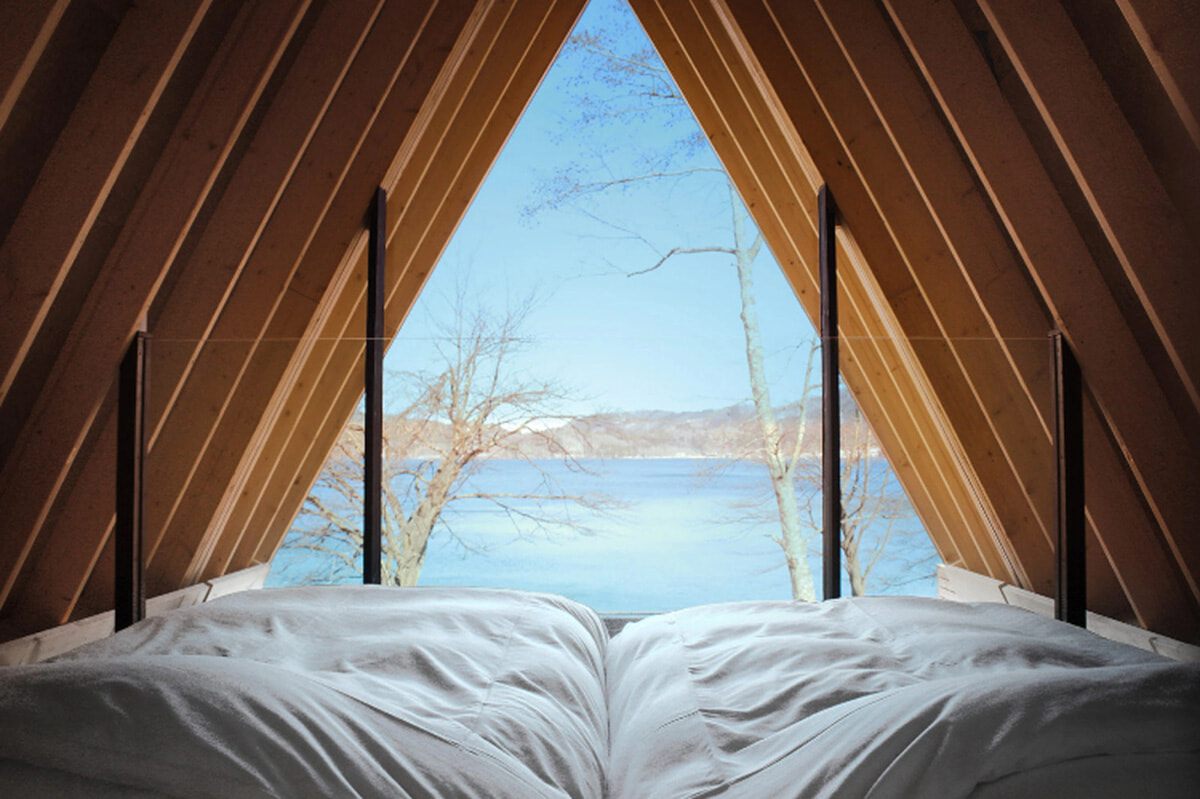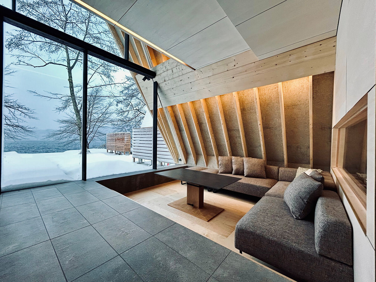 3つのヴィラはいずれも、大きな三角屋根が特徴のAフレーム構造。湖畔側に設けた大開口の窓からは、朝に夕に刻々と表情を変える青木湖が飛び込んでくる。