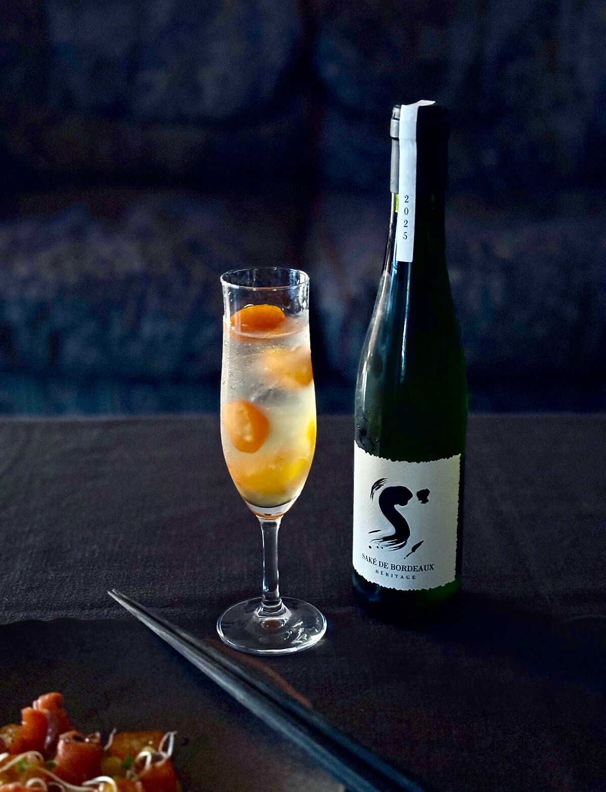 今回は、フルートグラスに氷と金柑の白ワイン煮を交互に重ね、そこにシロップと日本酒を合わせてみました。柑橘らしい爽やかさとほろ苦さが、すっきりとした日本酒によく合います。