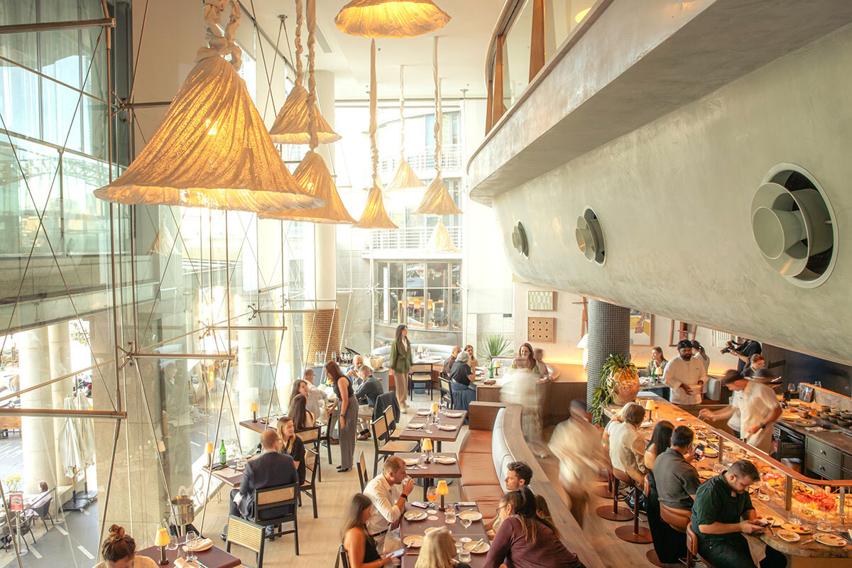 オーストラリアのグルメシーンを牽引するファインダイニングといえば、2024年7月にグランドナショナルホテル内に移転してパワーアップした「セイント・ピーター」の名が筆頭に上がるだろう。 昨年、グルメ・トラベラー誌のレストラン・オブ・ザ・イヤーにも選出。”魚料理の魔術師”と異名をもつジョシュ・ニランドシェフの料理は唯一無二で、「ウロコから尾まで」をコンセプトに、魚介類の内臓や骨なども含め90%以上を使用して芸術的な料理に昇華させる。シグネチャーの魚のシャルキュトリーの皿にはマトウダイのレバーパテタルトに、魚のチョリソーやモルタデッラなどがのせられ、デザートにはマグロの目を滑らかなバニラクリームに変えたマカロンが登場するなど(マグロの目の味はまったく感じさせない)、どれも「これは本当に魚なの!?」と思わせる新感覚のおいしさ。骨は燻製にしてからパウダーにしてスープや麺に練りこみ、魚はドライエイジングすることで風味を豊かにするなど、あの手この手で魚をおいしくする手腕を提示し、ゲストを驚かせてくれる。ニランドシェフの目標は人々が魚に対する偏見を捨て、さまざまな部位のおいしさに気付いてもらい、食品ロスを減らすこと。その啓蒙活動は確実に実を結んでいる。