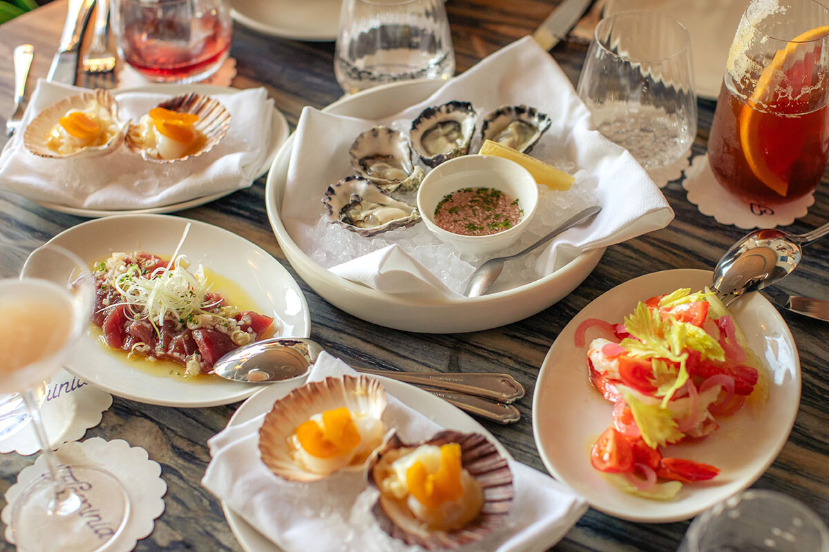 オペラハウスにほど近いサーキュラー・キーに、2025年12月にオープンしたばかりのシーフードに特化したイタリアンレストラン。コンセプトはイタリアの港町。メニューにはオーナー出身のサルデーニャの港町カリアリをはじめ、ナポリ、ヴェネツィア、ジェノバ、パレルモといった5つの港町の料理から厳選された前菜、パスタ、メインディッシュ、デザートが用意されている。この店の目玉は、オーストラリア産のキハダマグロ、ホタテ、サーモン、ヒラマサなどの生魚を、オリーブオイルとホワイトバルサミコなどのシンプルなドレッシング(5地域5種類ある)で和えた「クルード」(生の魚介類料理)が堪能できること。食材が新鮮なため、シンプルな味付けが生きてくる。また、知られざるイタリアの魚介料理が郷土料理が食べられるのもこの店の醍醐味。ナポリ名物「モッツァレラ・イン・カロッツァ」はモッツァチーズに衣をつけて揚げ、アンチョビと赤唐辛子のソースをかけたワインが進む一品。サルデーニャのカニとからすみ、レモンの香りのするオーストラリア固有のハーブ、レモンマートルのソースのパスタはおかわりしたくなるおいしさだ。目の前のハーバーを眺めながら、スパークリングワインのグラスと共に、至福の時間を過ごしたい。
