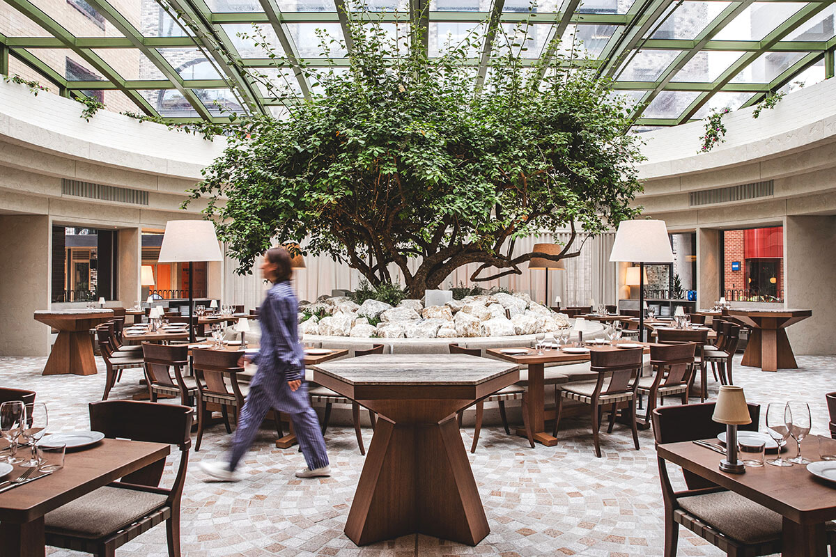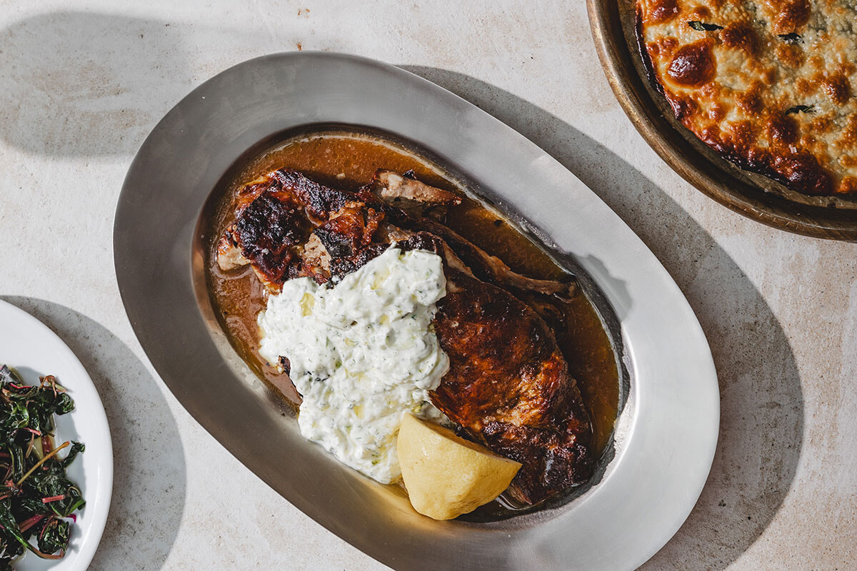 近年、モダンギリシャ系のレストランが次々とオープンしているなか、最も予約が取れない大人気店が「オリンパス」だ。まずは、「メゼ」という酒のつまみや前菜として供される小皿料理をいろいろ頼んで、スパークリングワインやカクテル、モクテルと一緒に楽しみたい。乾燥そら豆のディップや野菜のマリネも人気だが、各テーブル必ずと言っていいほどオーダーするのが、ハチミツとレモンのソースがクセになる、表面をカリカリに焼いたチーズ料理「サガナキ」。発酵させたマスカット果汁と唐辛子を合わせたチリソースで食べるラム肉の脳みそフライは、外はカリっと中はトロッとマイルドな味わいで魚の白子のよう。食材の良さがわかるタコの炭火焼グリルやイカのソテーなどもおすすめだ。ガッツリお腹がいっぱいになりたい人は長時間低温調理したトロトロのラム肉ショルダーをぜひ。洗練された料理のおいしさもさることながら、ガラス張りの天窓がパティオのような中庭感を演出しており、開放感あふれるスタイリッシュな空間も人気の秘密だ。