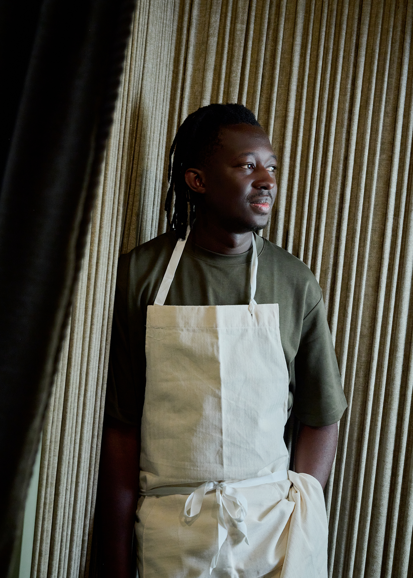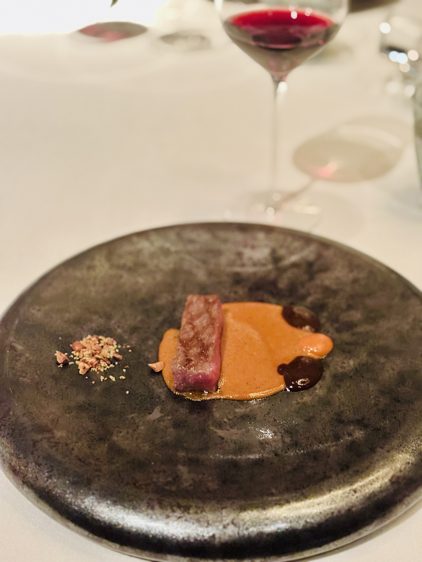 この日、最も感激したのが和牛のひと皿。聞き慣れない“マフェ”というのは、マリなど西アフリカの家庭で定番の煮込み料理のこと。両親がマリ出身ということで、自身のルーツでもある西アフリカの料理や調理法をフレンチに落とし込むのがシェフの真骨頂。ピーナッツバターを使ったコクのあるソースに、サッコシェフはタマリンドソースも添えてアレンジ。タマリンドの酸味が味蕾を刺激し、和牛の脂とも相性抜群。アフリカ料理はまだまだ経験不足で未知ですが、このじわじわくる旨味は日本人の口にも合いそう!と新発見。