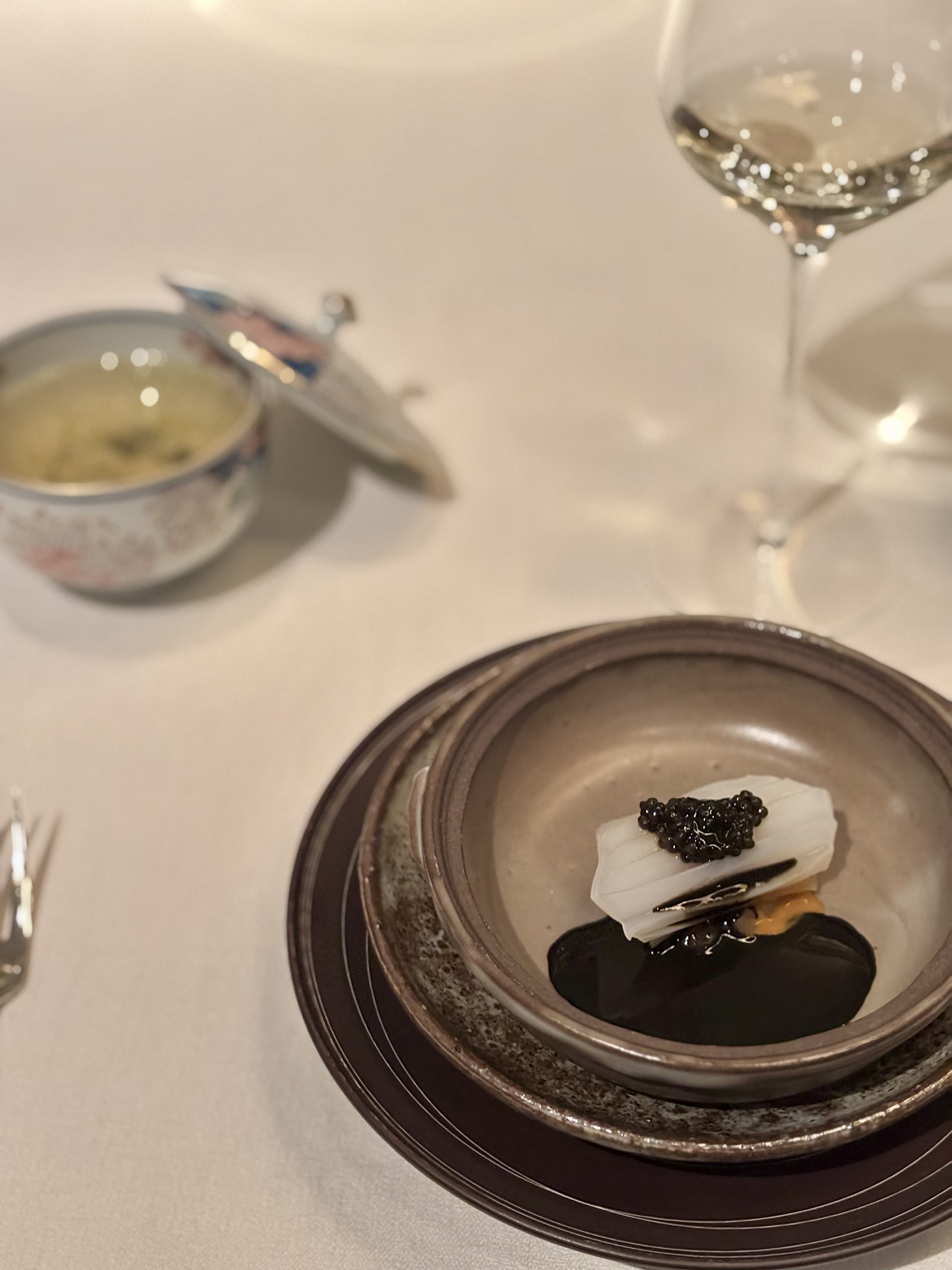 最初に提供されたのは「キャビアと出汁 コウイカ ウニ キャビア 仔牛のジュ」。イカ×ウニを食べると、反射的に鮨を食べているような感覚に。けれどそこはやっぱりフレンチ。仔牛のジュを使ったソースが合わさることで、深味が増します。