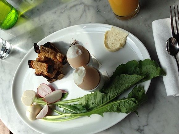 ブランチでいただいた「Dippy eggs – soft boiled eggs with radishes and kefir butter」13ドル。ボイルドエッグ2つに、なんともフレッシュなラディッシュが美味しい!