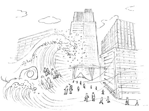 東京ミッドタウン、プラザ1F(外苑東通りぞいの東京ミッドタウンの玄関口)には、インフォーメションプレイスの登場です。鈴木康広さんのデザインで、北斎の富士をイメージしたそう。「動きまわる波を不動の富士と同時に描き、生き生きと固定して見せた北斎の鮮烈な画面のように、一瞬時が止まったようにも感じられる、崩れる寸前の波のフォルムを”背もたれ”に見立てます」。皆で座ることができるようです。
