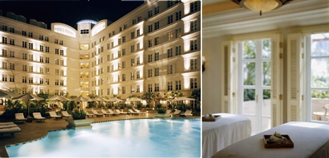 (左)ホテルの中庭に作られた大きなプール(右)ツインルームタイプの「スアン・スパ」トリートメントルーム