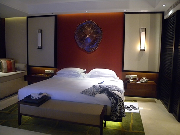 ホテルはどこまで贅沢になるの・・・?これが私の第一印象です。「バンヤンツリー・マカオ」の豪華さに驚かされました。すべてがスィートルームからなる客室は、最も小さい部屋「グランド・コタイ・スィート」でも100㎡はあるという広さです。さらにすべての部屋にプール(ホテルではリラクゼーションプールと呼ぶ)があり、その大きさも、小さいもので4.7m×1.7mあり、充分に広いプールです。客室内のアメニティはすべて揃い、日本の丸い木桶を思い出すバスタブ、レインシャワーもハンドシャワーもそれぞれ2個づつ設置されたシャワー室、充分に広いリビングエリアなど、贅沢三昧の客室でした。