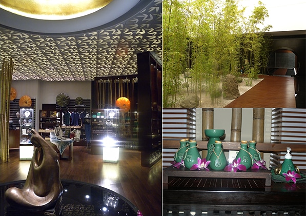 (左)スパのエントランスにあるギャラリーブティック(右上)スパ内に創られたフリースペース(右下)バンヤンツリースパ・オリジナルのアロマオイルの瓶