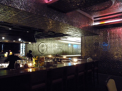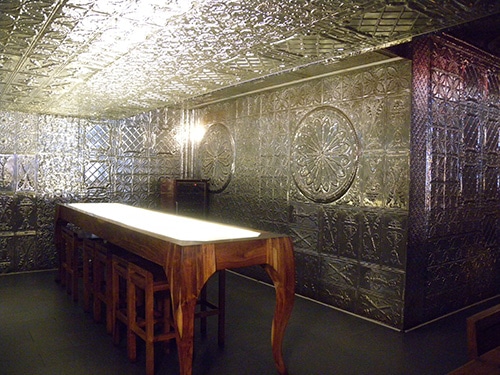 「333Restaurant& Bar」の個室使用のスペース。全体にメタル・スチールのアートワークが圧倒的な印象。