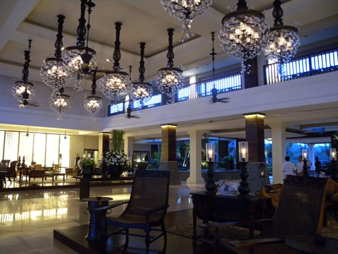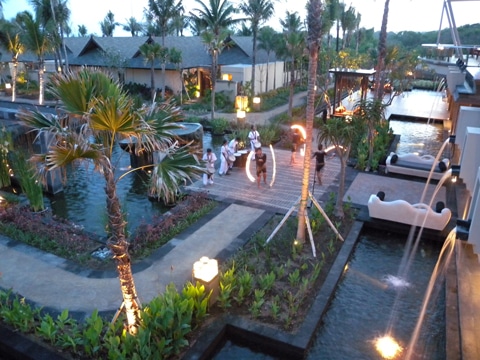 夕暮れも迫る頃になると、メイン棟の2階にあるバー&ラウンジ「キングコール」のテラス席がゲストで埋まります。というのも1階のイベントスペースでは、ファイヤーダンスのショーが毎夕開催されるからで、カクテルやアペリティフを手に、上から観下ろす観客で一杯になります。ディナーの前のひと時を、こうして楽しみながらエキサイティングなショーを観るなんて、いかにも大型リゾートホテルならではの醍醐味です。(KS)