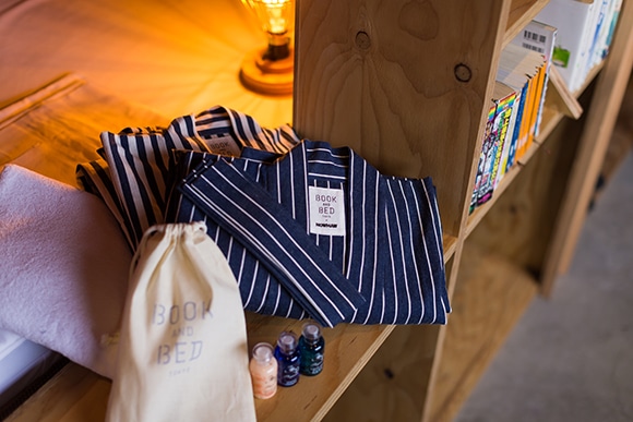 パジャマブランド「ノウハウ」がデザインしたオリジナルパジャマの貸し出し¥1,080、バスタオル貸し出し、アメニティセット各¥540。友達の家に遊びに来たような感覚で泊まることができる。