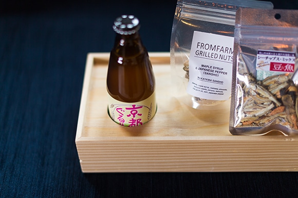 ドリンクをオーダーすると、ベッドやソファで倒れないように木のトレイに入れて運んでくれる。地ビールのほか、水、コーヒー、カフェラテがある。地ビール¥600〜、スナック¥200〜