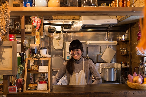 喫茶店や「恵文社一乗寺店」などを経て、こちらの店長となった四宮真澄さん。リトルプレスやジン、雑貨のセレクトを担当するほか、喫茶の料理やお菓子、ドリンクを手がけている。