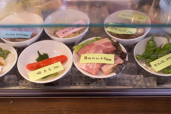 カウンターのガラスケースにもアテが並ぶ。料理はいずれも¥200〜¥500という手頃な価格。