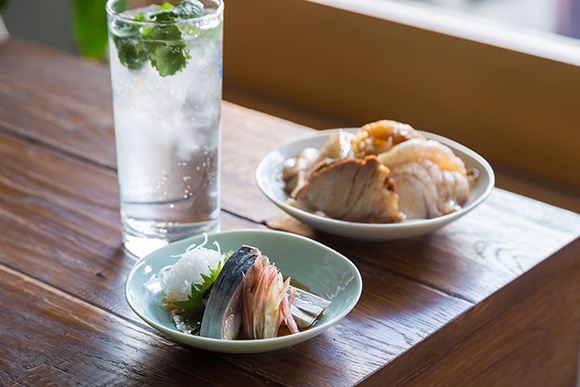 一乗寺の人気ラーメン店「夢を語れ」のジューシーなチャーシューに、もやしとニンニクを合わせた「豚皿」、果実酢にパクチーを漬けたシロップを使った「パクチーサワー」などパンチのあるメニューも。「豚皿」、「鯖きずし」各¥450、「パクチーサワー」¥450
