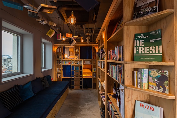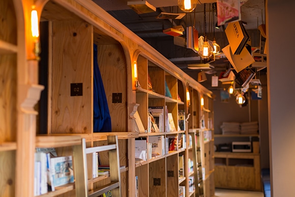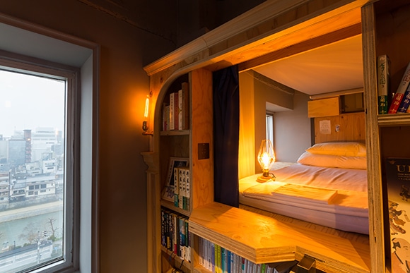 「泊まれる本屋」をコンセプトにした人気ホステルの2号店が、2016年12月、京都に誕生。雑居ビルの9階、ドアを開けて奥へ進むと、フロアの中央に巨大な本棚が。約3200冊の本のセレクトを手がけたのは、地元の人気書店「恵文社一乗寺店」。小説、エッセイ、写真集、雑誌、漫画など、幅広いジャンルをカバー。実際に本を購入することはできないけれど、本棚の中に設けたベッドスペースや周りに配したソファ席で、思う存分読書に耽ることができるのだ。三方の窓から、南座、鴨川、京都タワー、大文字まで望める見晴らしのよさも魅力。デイタイム利用があるから、旅行客だけでなく、地元からも注目を集めている。