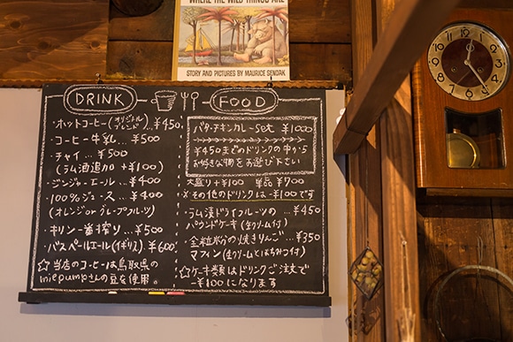 壁には手書きのメニューがずらり。昼飲みも可能だけど、本格的な酒場始動は17時から。コーヒーは北白川の人気焙煎所「WEEKENDERS COFFEE」の豆で、深煎り、中煎り、浅煎りが選べる。