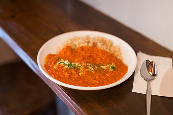 すり鉢で潰した数種のスパイスと飴色になるまで炒めた玉ねぎをトマトの水分だけで煮込んだ「バターチキンカレー」¥700。奥深くマイルドな味わいで、クセになりそうなおいしさだ。