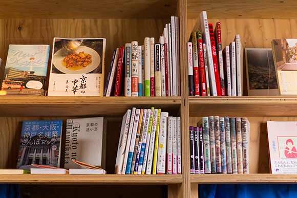 京都関連の本を集めたコーナーも。旅行者はデイタイムにカフェ代わりに利用するのもオススメ。