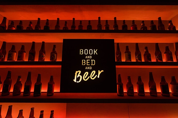 BOOK、BEDに続く3つ目のBとして京都店ではBEERをプラス。京都産を中心に地ビール10種を揃える。ピンクの照明が雰囲気たっぷりのバースペース。どこにあるかは泊まってからのお楽しみ。