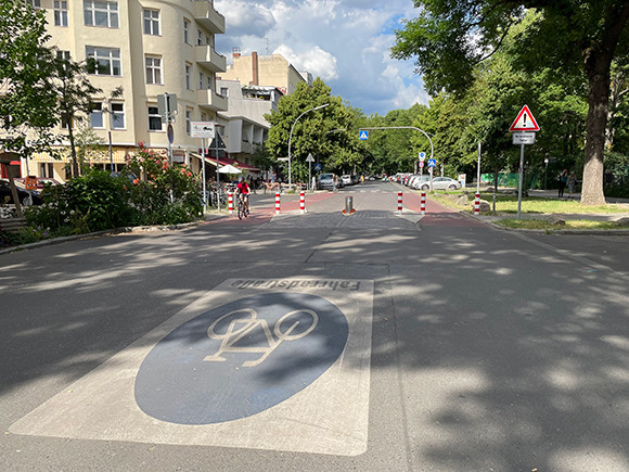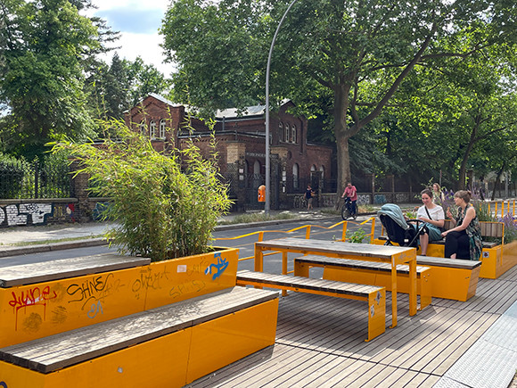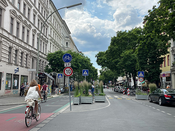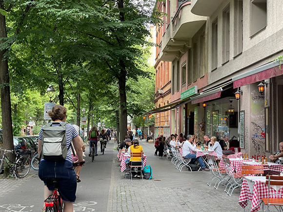 屋外テラスが心地よい季節。ベルリンでは、車両が入れない通りを作ったりスピード制限や一方通行を導入することで、みんなが外に出て過ごしやすいエリアを作ろうという動きが起こっている。その中心となっているのが、フリードリヒスハイン=クロイツベルク地区だ。ベルリン市内にある12区の中でも、環境保護などSDGsに関する意識が高いこの地区。区長のクララ・ヘルマンさんは今年6月、ベルリン・ブランデンブルク放送のインタビューにこたえ、地区住民の大半が自動車を所有していないことにも触れ、全体で車の交通量を減らすことで子どもや歩行者、自転車を使う人たちが安心してのんびり外で過ごすことができる、暮らしやすい地区を作りたいと発表している。