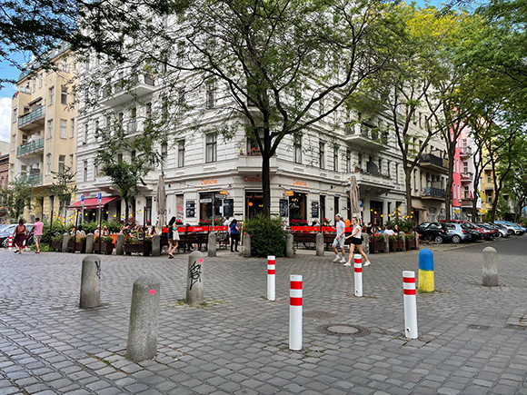現在パイロットプロジェクトが行われているのが、カフェやレストランなど飲食店が集まるベルクマン通り周辺と、グレーフェ通り周辺のエリア。日中はマーケット、夜は人気のナイトスポットも近くにあり、どちらもベルリンっ子はもちろん世界中からの旅行者が集まる注目の場所だ。グレーフェ通りでは障害者用とカーシェアリング、荷物の運搬用の車だけが駐車が可能になり、住民は近隣の立体駐車場を月30ユーロで使えるようになるという。歩行者が車道も歩けるようになったので道に面した飲食店は歩道いっぱいにテラス席を広げて、大変な賑わいだ。パンデミックで苦戦を強いられた飲食店が席数を増やせるようにも配慮されている。車通りが減ったことでのんびりと肩の力が抜けた雰囲気が漂い、食事やドリンクを楽しんだ後も、ちょっと街を散歩してみたくなる。