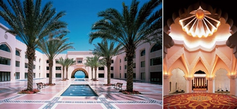 (左)コートヤードから海を望む(右)アラビアン様式の建築が美しいロビーエリア
