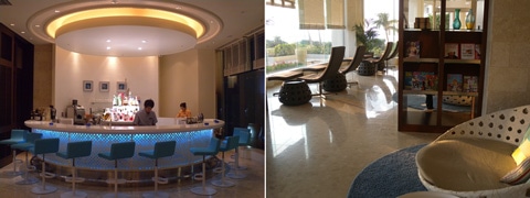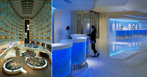 (左)ライトアップされた吹き抜けの空間、LED照明を使用し色も変化する(右)レセプションは海をイメージさせる白とブルーの爽やかな印象