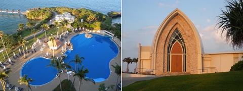 (左)上階から眼下に見えるプール、10月末までオープン(右)敷地内に2軒あるチャペルの一つ「アクアルーチェ・チャペル」
