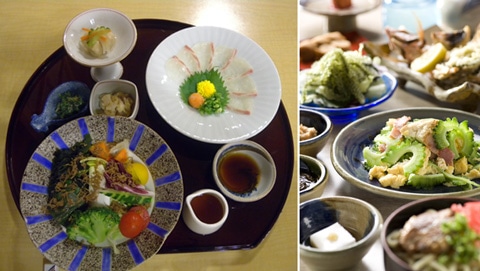 (左)和食レストラン「雲海」で提供される「ヘルシー御膳」の一部(右)沖縄料理「オーキッド」のバイキングから