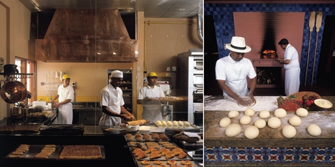 (左)毎日手作りのパンが楽しめるベーカリー。(右)イタリアン・トラットリアのピザ作り。
