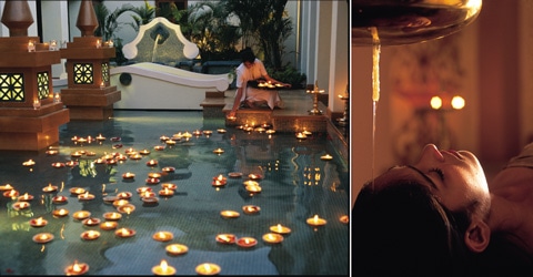 (左)「セレノスパ」のエントランス・ロビー。(右)アーユルヴェーダのハイライト「シロダーラ」の施術。