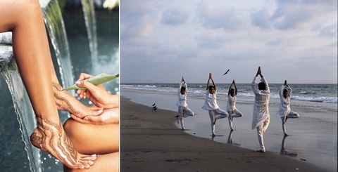 (左)植物のヘナで描くタトゥーは殺菌効果があるが現代はお洒落も兼ねる。(右)ビーチでの早朝ヨガ。
