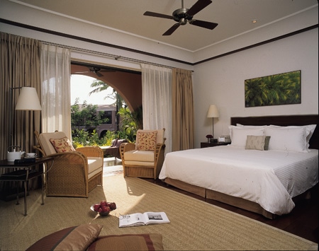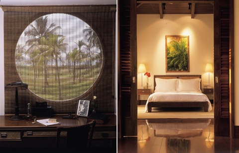 (左)庭を通して海が見渡せるプレジデンシャル・スイート。(右)エグゼクティブ・スイートの寝室。