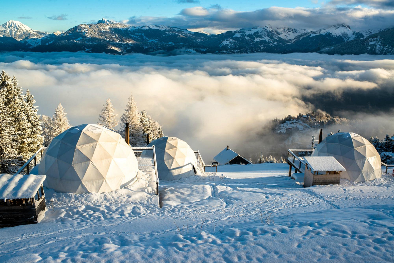 スイス・アルプスの標高約1,400メートル地点に位置する、幾何学的なドーム型客室が特徴のホテル。ジュネーブ空港から車で約1時間半かかる山奥にあり、受付から客室までは山道を歩かなければならない。特に冬場は道が雪に埋もれたり凍結したりすることも多く、スノーシューが必要な場合も。