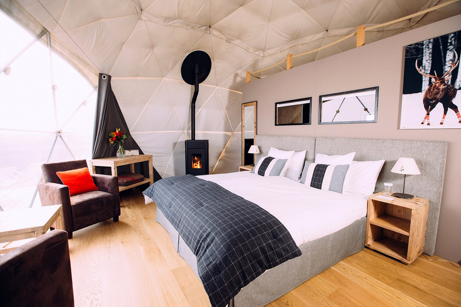 ポッドの中に一歩入れば、薪ストーブ、選び抜かれたオーガニックなインテリア、快適なベッドが用意され、特徴的な大きな窓からはレマン湖やアルプスの山々の圧倒的な眺望を楽しめる。自然の中で孤立して過ごす、静寂とプライバシーが最大の魅力。