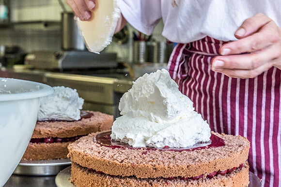 たっぷりクリームを使うのがポイント。カロリーは直径26センチのホールケーキで4000カロリー超え!(レシピによって異なります)