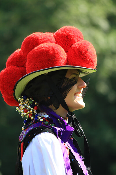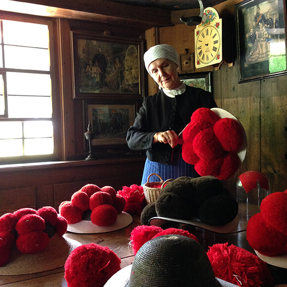 このケーキの元となったとも言われる民族衣装。「ボレンフート」と呼ばれる帽子が特徴。未婚の女性は赤いポンポン、結婚していると黒になる。